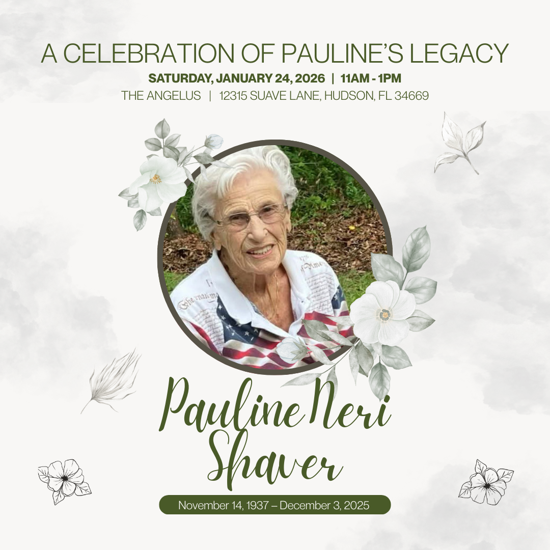 OUR SERVICESMany of you have asked about gathering to honor Pauline, and with grateful hearts, we invite you to a Celebration of Her Legacy on Saturday, January 24, 2026, from 11:00 a.m. to 1:00 p.m. True to Pauline’s joyful spirit, the day will feature an ice cream social with wine and coffee—arrive at 11:00 to enjoy treats, stroll the grounds, and reflect, followed by a brief tribute at noon near the Garland Williams Pavilion, where she will be reunited with Dave. In lieu of flowers, please consider a donation to The Angelus to continue the legacy she cherished. We hope you’ll join us in celebrating a life so beautifully lived.